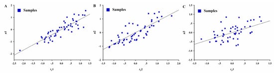 The relationships between the score of supermatrix T and that of matrix Y under the latent variables space of the MBPLSPM. (A) tT1 vs. u1; (B) tT2 vs. u2; (C) tT3 vs. u3.
