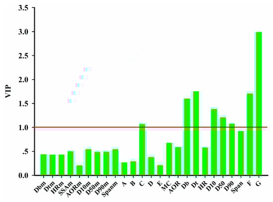 Variable importance in the projection (VIP) indexes of each variable in the MBPLSPM. A–F refers to pre-mixing time, impeller rate, binder amount, liquid additive rate, granulation time, lubrication time and minimal punch tip separation distance, respectively.
