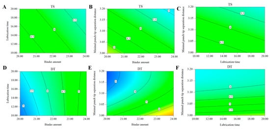 The coefficient of determination (R2) and the adjusted coefficient of determination (R2adj) for the prediction model of TS were 0.863, and 0.836, respectively, while the coefficient of determination and the adjusted coefficient of determination for the prediction model of DT were 0.828, and 0.8096, respectively. In addition, the analysis of variance was performed on the regression models. It was confirmed that the models were statistically significant with a p value <0.5. These results indicated that the established models were acceptable and suitable for building the design space. Based on the established regression models, the contour plots were constructed to visualize the effects of the binder amount, lubrication time and minimal punch tip separation distance on the DT and TS in Figure 12. It could be inferred from contour plots that increasing the binder amount, lubrication time, and the minimal punch tip separation distance would result in tablets with higher TS while decreasing the binder amount and lubrication time, and increasing the minimal punch tip separation distance would result in tablets with faster disintegration.
