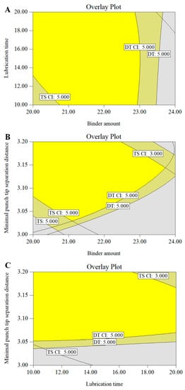 The design space for the PNS IRT production process; (A) binder amount vs. lubrication time; (B) binder amount vs. minimal punch tip separation distance; (C) lubrication vs. minimal punch tip separation distance.