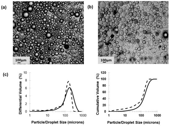 Optical images of water-in-oil (W/O) emulsion droplets, crosslinked microparticles, and size distribution of phage-containing emulsion droplets and microparticles: (a) water-in-oil emulsion, (b) microparticles produced from W/O emulsions following toluenesulfonic acid (TSA) and CaCl2 crosslinking, and (c) droplet and particle size distributions (solid lines—droplets; dashed lines—particles).