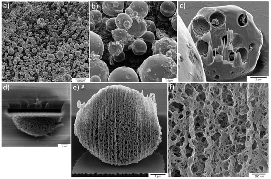 The morphology of the microparticles was found to depend upon the sample preparation method (Figure 3). Freeze-dried microparticles appeared as spheres with a smooth and uniform surface (Figure 3a,b). Cutting with Ne+ allowed visualization of the internal structure of the freeze-dried microparticles, which were found to be porous (Figure 3c). CPD-dried microparticles displayed a sponge-like surface (Figure 3d). The internal structure was found to be porous with an interconnected network of much smaller pores compared to the freeze-dried sample (Figure 3e,f).