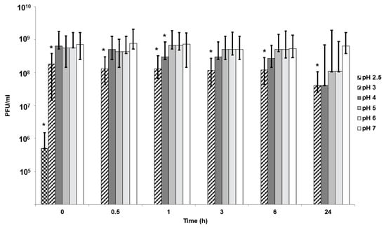 Effect of pH on free phage viability in 0.2 M NaCl solution. *Significantly different phage titres using a 2-sample t-test at each condition compared with phages exposed to pH 7 at the corresponding time point. Time point 0 h denotes the time between 0–10 min for phages exposed to all pH values except pH 2.5, where the phage titre reduced rapidly, and data is plotted 10 s post exposure.