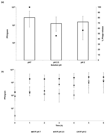 In vitro phage stability experiments where phages (encapsulated and free phages) are exposed to different acidic pH encountered in vivo may be a useful predictor of in vivo phage survival and a prerequisite during formulation development prior to testing in animal models. Unencapsulated bacteriophages were highly sensitive to acidic pH exposure with complete loss of viable phages within 10 min at pH 2.5 (Figure 4). The loss of unencapsulated phage activity upon exposure to an acidic environment highlights the need for encapsulation in order to deliver controlled high doses of viable phages to the infected gut using oral dosage forms. Phage encapsulation in the ES100/alginate microparticles protected them from acid damage at pH 2 (Figure 5). The combination of small particle size (Figure 2) and pH-responsive character of the ES100/alginate microcapsules resulted in release of encapsulated K1F phages within the first hour upon exposure to pH 7 (Figure 5b). Ten percent of the encapsulated phage dose was released at pH 5, whereas 50% of it was released at pH 6 after 2 h of exposure to SIF. Complete phage release and complete dissolution of microparticles occurred within 1 h upon exposure to pH 7 (Figure 5b). It took 1 h longer for SGF-exposed EK1F phages to amplify to levels reached in bacterial cultures compared with a free phage dose of 106 PFU/mL (Figure 7b). This delay may be attributed to slower release kinetics of SGF-exposed EK1F phages (Figure 5b). The encapsulated phages were not released immediately upon addition of the microparticles to the bacterial cultures; therefore, it took extra time for the phage titre to reach levels similar to an equivalent free phage dose. Previous published research on phage encapsulation employing large microparticles (~1 mm) reported slower sustained-release kinetics for phages encapsulated in alginate microcapsules [,]. Colom et al. [] reported faster release from small alginate microparticles containing CaCO3 as antacid (mean size ~100 µm). However, in that particular study, exposure to simulated gastric fluid (pH 2.8 for 60 min) resulted in between 2 and 3 log reduction in Salmonella phage titre, suggesting that even with the addition of CaCO3, phages were highly susceptible to SGF []. The ES100/alginate formulation used in the present study for similarly sized small microparticles showed considerably better acid protection and released phages in response to a pH-trigger.