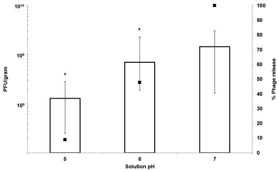 Release of encapsulated bacteriophages from EK1F microparticles: Phage release (PFU g−1) after 5 h from EK1F microparticles in Simulated Intestinal Fluid (SIF) at different pH values following prior exposure of microparticles to Simulated Gastric Fluid (SGF) at pH 2 (2 h exposure to SGF). The black squares represent the % phage release. *Significantly different phage titres (p < 0.05) for a 2-sample t-test with each sample compared with phage release from EK1F exposed to pH 7.