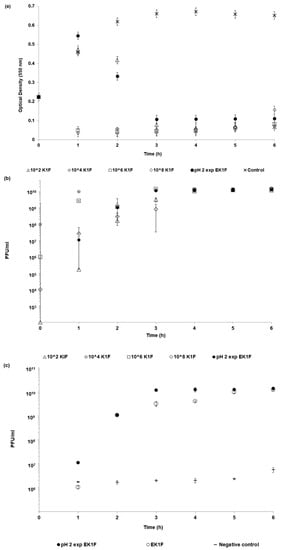 The effect of encapsulated phage (EK1F) and free phages in killing bacterial was investigated. Bacteria were grown from a single colony until log phase was reached at 0.2 (O.D. 550) (approximately 108 CFU/mL). E. coli strain EV36 bacteria were grown either in LB or cell culture media (Leibovitz), as described previously []. Two mL of bacteria (at 0.2 OD) were added to 24-well tissue-culture plates. Twenty µL of free phage (non-encapsulated) was added at different concentrations (resulting in working concentrations of 102, 104, 106, and 108 PFU/mL). Twenty µL of encapsulated phages (EK1F) were also added to separate wells containing 2 mL of bacterial culture. Encapsulated phages were tested either without acid exposure or after exposure to SGF (pH 2) for 2 h. Negative controls contained 20 µL of EK1F in LB media or cell culture media without bacteria. Positive controls contained bacteria only. After phage/EK1F addition, the samples were withdrawn at hourly intervals up to 5 h post phage/EK1F addition. At each time point, 1 mL of sample was removed to record the O.D. One mL of the sample was centrifuged at 2000× g to remove infected cells and to measure phage titre using plaque assay.