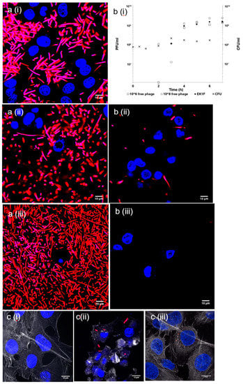 Live and confocal microscopy images of E.coli strain EV36-RFP cells (red) treated with microencapsulated EK1F in the presence of epithelial cells (blue): (a) Controls without phages (i) 2 h, (ii) 3 h, and (iii) 5 h following incubation of epithelial cells with E. coli strain EV36; (b) (i) phage amplification of free phages and EK1F in the presence of E.coli strain EV36, and live microscopy images of EK1F treated samples at (ii) 3 h and (iii) 5 h following incubation of epithelial cells with E.coli strain EV36; (c) (i) control epithelial cells not exposed to E.coli strain EV36, (ii) damaged actin visible for epithelial cells exposed to EV36 with no phage treatment, and (iii) the condition of actin of epithelial cells exposed to E.coli strain EV36 and treated with EK1F.