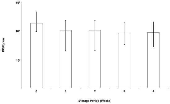 EK1F microparticles were stored over a course of 4 weeks under refrigerated conditions (at 4 °C). There was no statistical change in the K1F phage titre, which remained constant at ~108 PFU g−1 over the storage period (p < 0.05) (Figure 9 and Table S1).