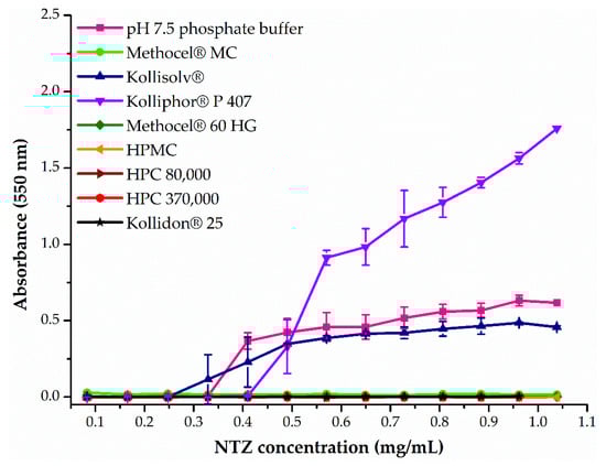 A total of eight candidate polymers were evaluated to test their ability to maintain NTZ solubilized: Methocel® MC, Methocel® 60 HG, HPMC, HPC 80,000, HPC 370,000, Kollisolv®, Kolliphor® P 407, and Kollidon® 25 (see Table S1, for further polymer details). The tests were performed by the modified solvent shift method proposed by Childs et al. in 2013 [], see Figure S1. Aqueous solutions were prepared containing 0.5% w/v of each pre-dissolved polymer in pH 7.5 phosphate buffer solution (PBS) and also one containing only buffer solution. A volume of 3 mL of each medium was placed in a spectrophotometer quartz cell, followed by a stepwise addition of a total of 13 aliquots of 10 µL each from NTZ stock solution in DMSO (25 mg/mL) at 5 min interval times. The ability of the polymeric compounds to maintain the API dissolved was determined by analysis of the presence or absence of precipitated NTZ in solution, which can be monitored by UV-vis spectrophotometry measured at λ = 550 nm.