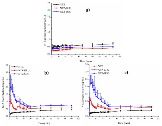 Powder dissolution profiles of NTZ and the cocrystalline phases NTZ-GLU and NTZ-SUC in: (a) pH 7.5 PBS; (b) PBS with pre-dissolved HMPC (0.5%, w/v); and (c) PBS with pre-dissolved Methocel® 60 HG (0.5%, w/v) (n = 3 ± SD).