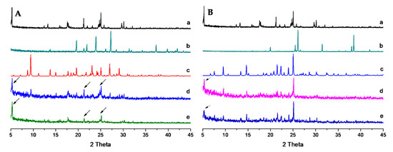 Comparison of powder X-ray diffraction (PXRD) patterns: (A) (a) NTZ, (b) GLU, (c) NTZ-GLU simulated from SCXRD data. Solids recovered after powder dissolution tests of NTZ-GLU under non-sink conditions in pH 7.5 phosphate buffer solution after (d) 2 min, and, (e) 5 min. (B) (a) NTZ, (b) SUC, (c) NTZ-SUC simulated from SCXRD data. Solids recovered after powder dissolution tests of NTZ-SUC under supersaturated conditions in pH 7.5 phosphate buffer solution after (d) 1 min, and (e) 3 min.