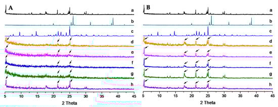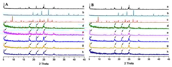 Comparison of PXRD patterns: (A) (a) NTZ, (b) SUC, (c) NTZ-SUC simulated from SCXRD data. Solids recovered after powder dissolution tests of NTZ-SUC under non-sink conditions in pH 7.5 phosphate buffer solution with pre-dissolved 0.5% w/v HPMC after (d) 1 min, (e) 2 min, (f) 3 min, (g) 4 min, (h) 5 min. (B) (a) NTZ, (b) SUC, (c) NTZ-SUC simulated from SCXRD data. Solids recovered after powder dissolution tests of NTZ-SUC under non-sink conditions in pH 7.5 phosphate buffer solution with pre-dissolved 0.5% w/v Methocel® 60 HG after (d) 1 min, (e) 2 min, (f) 3 min, (g) 4 min, (h) 5 min.