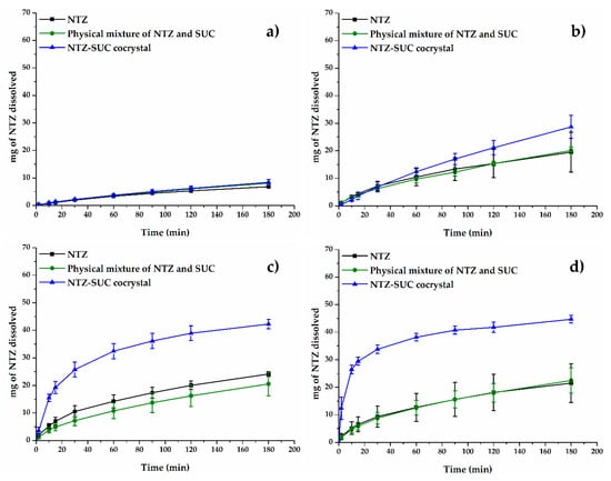 Figure 6a illustrates the dissolution profiles measured over a time interval of 3 h of the unformulated (0.0% w/w of Methocel® 60 HG) solid phases of pure NTZ, the physical mixture with SUC and the NTZ-SUC cocrystal. The drug dissolution profiles are similar (p > 0.05), achieving approximately 8 mg of dissolved drug (ca. 3% in relation to 250 mg of NTZ dose). In contrast, when the solid phases were formulated with 1.0% Methocel® 60 HG, the drug was dissolved in significantly larger amounts, either starting from the pure form, the physical mixture or the cocrystal (~17–27 mg of drug dissolved after 3 h). Although the graph associated to NTZ-SUC exhibits a larger increase, the statistical difference (p > 0.05) between the dissociation rates is not significant due to the relatively large standard deviation (Figure 6b). However, with larger amounts of Methocel® 60 HG polymer (2.5 and 5.0%), the NTZ-SUC cocrystal gave a significantly improved dissolution profile (p < 0.05) when compared to analogous formulations of pure NTZ and the physical mixture, achieving after 3 h, amounts of 42 and 45 mg of NTZ dissolved (Figure 6c,d). Furthermore, for the formulation of the cocrystal with 5% Methocel® 60 HG, the amount of NTZ dissolved after 2 min was already approximately 12 mg (Figure 6d), which is significantly larger than the final amount achieved by the corresponding unformulated solid phases (Figure 6a).