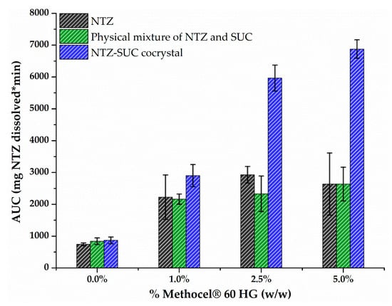 AUC of NTZ extracted from the dissolution profiles in pH 7.5 PBS for the following solid phases, which were formulated with different amounts of Methocel® 60 HG (0.0, 1.0, 2.5 and 5.0%, w/w): NTZ, 2:1 physical mixture of NTZ and SUC, and NTZ-SUC cocrystal.