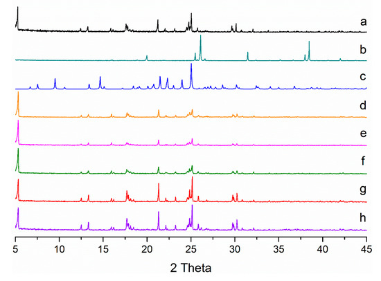 PXRD patterns of (a) NTZ, (b) SUC, (c) NTZ-SUC cocrystal (simulated from SCXRD data) and solid residues after dissolution tests in USP 1 apparatus: (d) NTZ-SUC formulated with 1.0% w/w Methocel® 60 HG, (e) NTZ-SUC formulated with 2.5% w/w Methocel® 60 HG, (f) NTZ-SUC formulated with 5.0% w/w Methocel® 60 HG, (g) NTZ formulated with 5.0% w/w Methocel® 60 HG, and (h) physical mixture of NTZ and SUC formulated with 5.0% w/w Methocel® 60 HG.