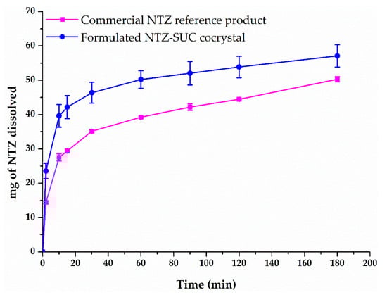 Finally, comparison of the dissolution profiles of NTZ-SUC cocrystals formulated with methylcellulose at 5.0% w/w with a commercially available NTZ medicine showed that pharmaceutical products containing co-crystallized APIs are promissory. In such a way, reduction of the NTZ dose might become feasible, which would be a large advantage for the administration of this antiparasitic drug, which requires large doses. However, we are aware that to draw conclusions about this possibility and to assure therapeutic efficacy with reduced adverse effects, in vivo studies are required.