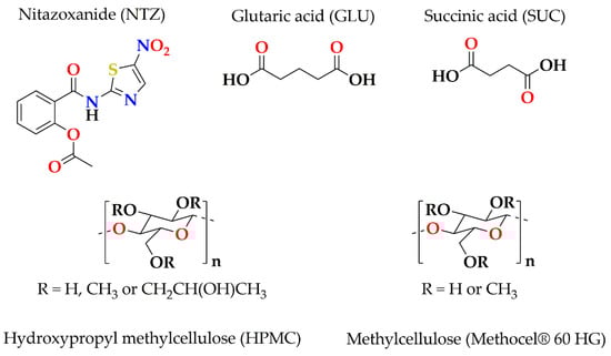 Nitazoxanide was kindly donated by Laboratories Senosiain, S.A de C.V., CDMX, México. Glutaric acid, succinic acid, hydroxypropyl methylcellulose (HPMC, MW: 26 kDa. This product has a methoxyl content of 19–24% and a hydroxypropoxyl content of 7–12%, viscosity 80–120 cP, 2% in H2O at 20 °C), methylcellulose (Methocel® 60 HG and Methocel® MC), hydroxypropyl cellulose (HPC 80,000 and HPC 370,000), polyvinylpyrrolidone (Kollidon® 25), polyethylene glycol (Kollisolv®) and poly(ethylene glycol)-block-poly(propylene glycol)-block-poly(ethylene glycol) (Kolliphor® P 407) were purchased from Sigma-Aldrich (St. Louis, MO, USA) as reagents for use only in the laboratory. All organic solvents used were purchased from J. T. Baker Chemical Co. (Phillipsburg, NJ, USA). Solvents and chemical compounds were used as received without further purification.