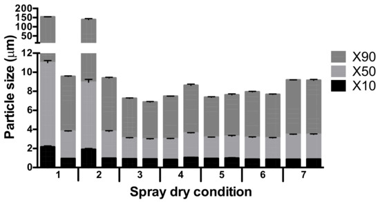 In Figure 1, the results of the primary size distributions of the powders containing 5% L-leucine produced using the seven spray-drying conditions are shown. Conditions 1 and 2 seem to result in a poorly reproducible formulation, where one of the samples has an X90 of around 150 µm and the other an X90 of around 10 µm. The other conditions seem to be more reproducible, with a possible exception of condition 4, where one sample results in slightly larger particle sizes. Overall, condition 3 seems the best, with the smallest X10, X50, and X90 values and only minor differences between the duplicates.