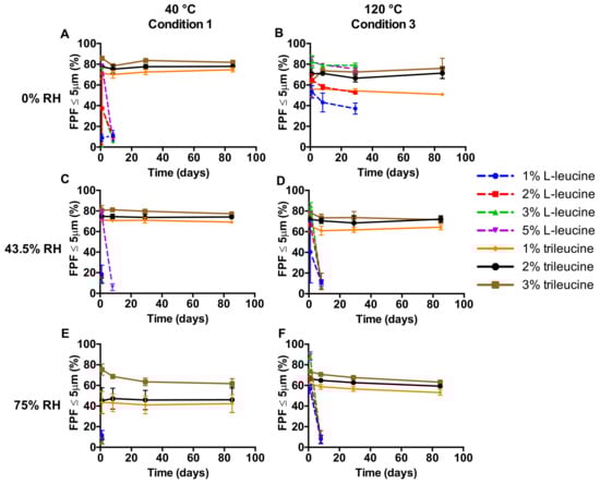 The dispersion by the Twincer® inhaler of the aforementioned powders is shown in Figure 3. As can be seen, for the L-leucine samples only the powders spray-dried at 120 °C, having an excipient content of 3% or 5%, and which were stored at 0% RH, resulted in an adequate FPF for at least one month. All other conditions tested resulted in adequate FPFs for less than one week. Again, the trileucine formulations performed considerably better. At all conditions tested, the powders resulted in FPFs suitable for pulmonary administration, even after storage for at least three months. The optimum formulation regarding FPF is the 3% trileucine formulation spray-dried at 40 °C. Stored at 0% and 43.5% RH, it results in a higher FPF than all other formulations over the three-month period. Only at 75% RH, the 3% trileucine formulation spray-dried at 120 °C disperses better than the one spray-dried at 40 °C. However, this difference is only 1.4% at the three-month time point. Furthermore, the formulation with 3% trileucine dried at 120 °C also shows a good performance.