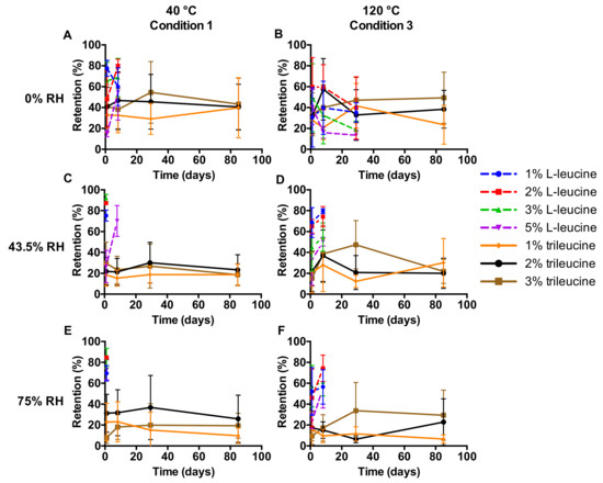 The powder mass retained in the inhaler during the dispersion measurements (i.e., “retention”) is presented in Figure 4. The retentions measured vary greatly and have substantial standard deviations. No apparent trend is visible except that the trileucine formulations generally result in a lower retention than the L-leucine formulations. Furthermore, storage of the trileucine samples at 0% RH result in a higher retention than storage at 43.5% and 75% RH. This difference may be caused by the stronger tribocharging at 0% RH.