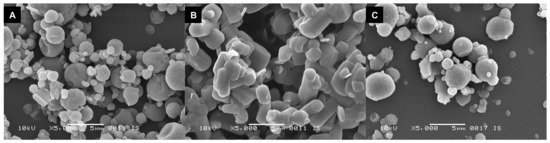 SEM images of spray-dried isoniazid. (A) shows the 3% L-leucine formulation spray-dried at 120 °C and stored at 0% RH for a month, while (B) shows the same formulation stored at 43.5% RH for a month. (C) shows the 3% trileucine formulation, spray-dried at 40 °C and stored at 43.5% RH for three months. Magnification: 5000x.