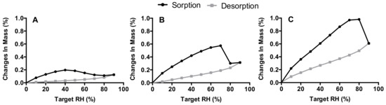 The dynamic vapor sorption (DVS) results. (A) shows the 3% trileucine formulation, spray-dried at 120 °C, (B) the 1% trileucine formulation, and (C) the 3% trileucine formulation. Both spray-dried at 40 °C.