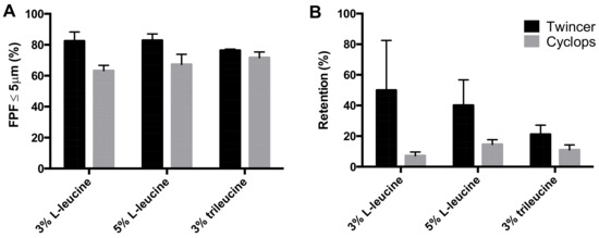 Comparison between the Twincer® and Cyclops® DPI with three isoniazid formulations dispersed at 4 kPa (n = 3, average ± SD). (A) shows the FPFs of the delivered dose from laser diffraction analysis, while (B) shows the retained powder mass as a fraction of the nominal dose (i.e., 50 mg). The L-leucine formulations are spray-dried at 120 °C, while the trileucine formulation is spray-dried at 40 °C.