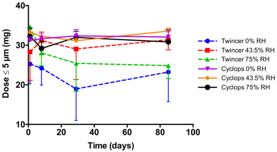 The fine particle dose delivered from the Twincer® and Cyclops® DPIs over a three-month storage period. Tests were performed with a 50 mg nominal dose of the 3% trileucine formulation spray-dried at 40 °C (n = 4, average ± SD). Powders were stored in open containers at 0, 43.5, and 75% RH.