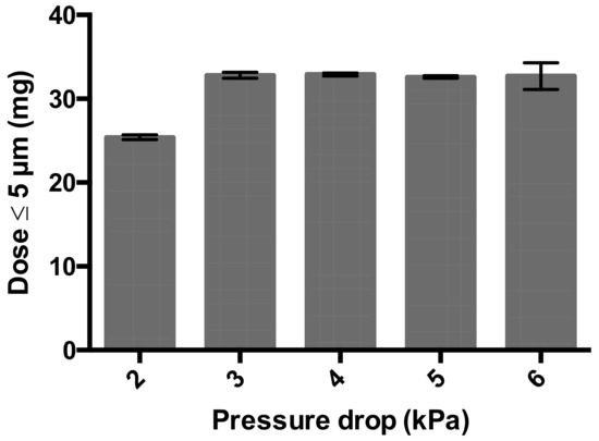 The robust dispersion performance of the cyclops with the 3% trileucine formulation is further demonstrated when the effect of the pressure drop on the fine particle dose from a 50 mg nominal dose is tested (Figure 9). At 2 kPa, the fine particle dose is 25.40 ± 0.27 mg. This increases to 32.80 ± 0.36 mg at 3 kPa and is stable at further increasing dispersion pressures.
