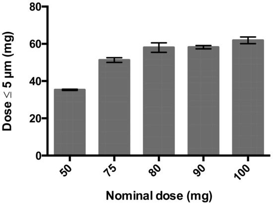 Fine particle dose from the Cyclops® DPI loaded with different nominal doses of the 3% trileucine formulation and dispersed at a pressure drop of 4 kPa (n = 3, average ± SD). The nominal dose refers to the formulation (e.g., the nominal dose of 100 mg contains 97 mg isoniazid and 3 mg trileucine). The fine particle dose is calculated by multiplying the FPF with the emitted mass (= FPF * (1 – retention)).