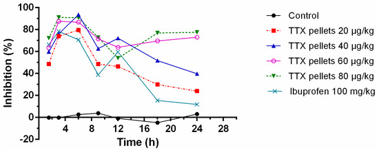 The percentage of inhibition of sustained-release TTX pellets at most time points could obtain 50% or above in a dose-dependent manner (Figure 6). The maximum effect appeared at 3–6 h. The inhibitory effect declined by time. However, for the 60 μg/kg and 80 μg/kg, their inhibitory effect could rise up again at 9–12 h, indicating their higher potential of antinociceptive effects with longer duration.