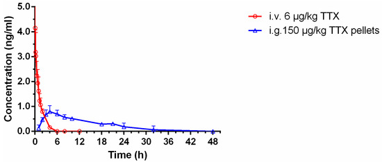 Mean plasma concentration-time profiles of TTX in rats following i.v. administration of TTX injection at 6 μg/kg body wt. (red curve) and i.g. administration of sustained-release TTX pellets at 150 μg/kg body wt. (blue curve) (n = 6, mean ± SD).