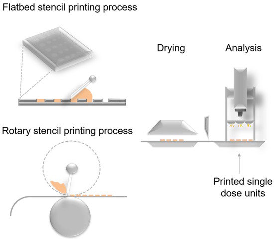 Stencil printing is a potential manufacturing method of ODFs or orodispersible discs that has not been explored before. Previously in other industries the method has shown to be suited as both a point-of-need and low-cost high-throughput manufacturing process [21,22]. Stencil printing is an impact printing method that enables pattern transfer mediated by a stencil (Figure 1). Stencil printing is a variant of screen printing in which the ink is distributed through the open pores of a patterned mesh/screen. In stencil printing the ink is passed through the stencil apertures with the help of a blade or a squeegee and can either be built as a flatbed or rotary printing process. Stencil printing has lately been utilized to manufacture wearable electronics with resolutions reaching from mm to a few µm [23,24,25]. The inks that have been used for stencil printing of electronics are solder pastes, which contain metal particles of specific particle size ranges, and the rheological properties of the pastes have been investigated with regards to stencil printability [26,27]. In general, screen and stencil printing technologies have been utilized in various fields, since it allows printing onto various materials (i.e., textiles, metal, plastics, ceramics, and paper) [28].