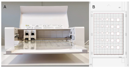 (A) A Silhouette Curio crafting cutter machine and (B) stencil aperture design.