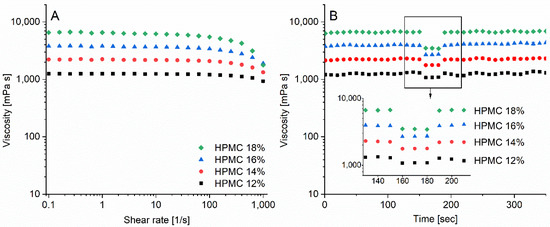 (A) Shear ramp of formulations containing 12–18% polymer (n = 3 ± std), (B) thixotropic flow measurements (shear rate: 0.1, shear rate: 500, shear rate: 0.1 s−1, n = 3 ± std) for hydroxypropyl methylcellulose (HPMC) 12–18%.