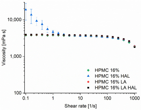 Shear ramp of HPMC 16% formulations (HAL = haloperidol, LA = lactic acid).