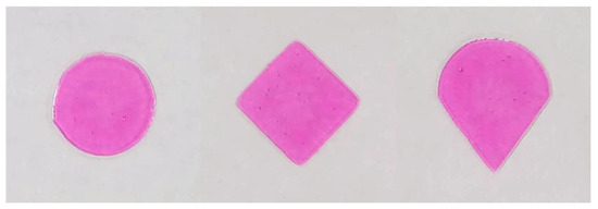 The printability was evaluated in terms of aperture filling of different geometries and spreading of the ink onto the release liner. The aperture geometry was evaluated at a fixed printing speed (259 mm/min) and using a 500 µm stencil with disc, square, and teardrop apertures. No clear difference in aperture filling was observed between geometries when ink formulation HPMC 16% was printed under the above-mentioned conditions (Figure 5). However, at higher speeds differences could possibly be distinguished. It has been reported that the aperture geometry should be rotated 45° to the printing direction to ensure uniform filling of the apertures [34]. Taking this into account, the square and teardrop (printed from the sharper direction) should be preferred. However, the circular geometry is less prone to slumping, meaning that it has a greater ability to retain the printed shape.