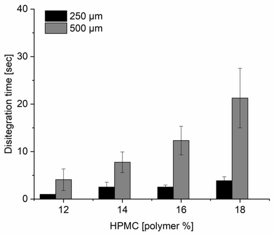 Disintegration time (s) for 18 mm disc formulations (n = 10) with increasing polymer content (12–18%) and 250 and 500 µm thick stencils.