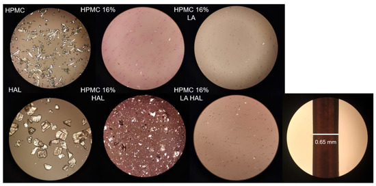 Polarized light microscopy of raw materials HPMC and haloperidol (HAL) and printed discs HPMC 16%, HPMC 16% lactic acid (LA), HPMC 16% LA HAL, and HPMC 16% HAL (magnification ×10), stencil height 500 µm.