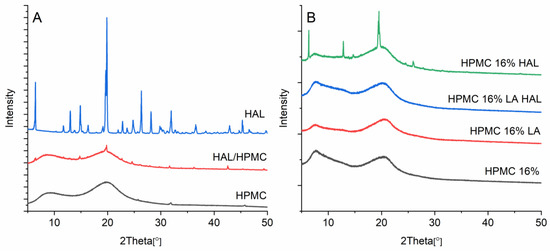 The printed formulation with HAL dispersed in the polymer matrix (HPMC 16% HAL) showed small diffraction peaks at 12.8, 14.9, 19.9, and 25.9 (Figure 9). These peaks correspond to those observed in the initial crystalline HAL. The HPMC powder was amorphous as suggested by the broad halos near 10° and 20° with a small diffraction peak at 31.9°, which is typical for the polymer. The physical mixture of HAL/HPMC (1/16) correspondingly showed the attenuated reflections related to the pure API on the amorphous HPMC background, suggesting limited interaction between the API and the polymer when only mixed. The printed formulation HPMC 16% LA HAL was amorphous. Consequently, the small addition of LA made the solvent mixture more acidic, which in turn enabled the drug to dissolve.