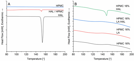 Thermograms of the (A) pure components and their physical mixture in 1:16 w/w ratio (HAL/HPMC) and (B) printed discs of HPMC 16%, HPMC 16% LA, HPMC 16% LA HAL, and HPMC 16% HAL, (stencil thickness 500 µm).