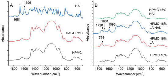 Infrared spectra of (A) pure HAL, HPMC, and physical mixture of HAL/HPMC (1/16) and (B) printed discs of HPMC 16%, HPMC 16% LA, HPMC 16% LA HAL, and HPMC 16% HAL.