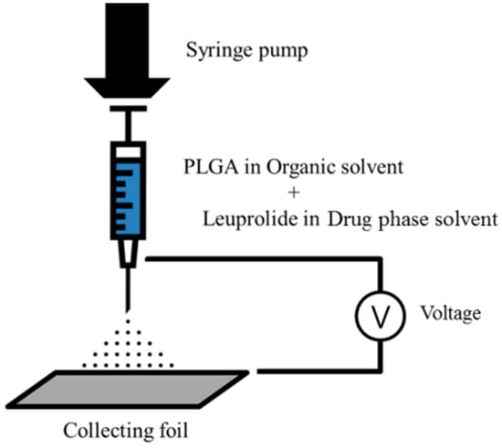 The formulation of electrosprayed microspheres was manufactured using ESR 100 electrospray equipment (NanoNC, Seoul, Korea). The PLGA and the leuprolide were dissolved in each solvent of polymer phase and drug phase, respectively, and the two solutions were completely mixed by vortexing for 5 min. These two mixed solutions were loaded in a 1 mL gas-tight syringe (Hamilton Co., Reno, NV, USA) equipped with a 23-gauge metal nozzle. The syringe was mounted on an electrospray device so that the distance between the tip of the nozzle and the collecting aluminum foil was 20 cm. Electrospraying was carried out under the following conditions: injection rate of 0.4 mL/h and an applied voltage of 16.1 to 18.6 kV. The dried matter was carefully obtained from collecting aluminum foil and stored in polyethylene tubes. The scheme of the electrospraying procedure is shown in