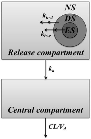 tr-e is the erosive release constant from ES to NS. The ratios of drugs contained in each section of NS, DS, and ES were defined as E1, E2, and E3, respectively. E1 is the ratio of non-encapsulated drug that represents an initial value of the release compartment and reflects the initial burst release of the drug. The drug encapsulated in DS and ES can be expressed at various rates using a transit model. E2 and E3 are released into the release compartment by constants k