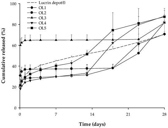 The release test was conducted in a heating dry bath (confido–S20H, Seoul, Korea) at 300 rpm and 37 °C for 28 days using polyethylene tube for investigating release of the reference drug (Lucrin depot®) and trial formulations. Phosphate buffered saline (PBS, Mediatech, Inc., Manassas, VA, USA) containing 0.02% Tween 80 was used as the release media, and 10 mg of Lucrin depot® or each trial formulation was added to 1 mL of release media to perform the release test. At predetermined sampling times (2 and 8 h, 1, 2, 4, 7, 10, 13, 18, 23, and 28 days), 0.8 mL of supernatant was collected after centrifugation at 3000× g for 3 min. Subsequently, 0.8 mL of fresh release media was added to the polyethylene tubes to maintain original volume. The concentration of the leuprolide in the collected supernatant was analyzed by HPLC-UV and quantified.
