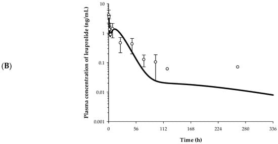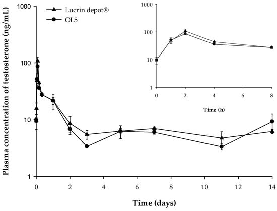 11]. A validated method was used to quantify the leuprolide in plasma and evaluate the PKs. The plasma concentration of testosterone was quantified to evaluate the PDs of the leuprolide using testosterone ELISA kits (R&D Systems, Minneapolis, MN, USA).