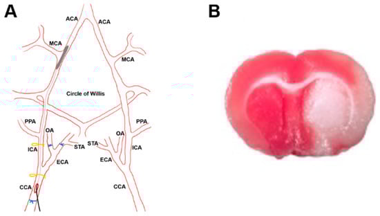 Stroke model. (A): Schematic representation of the stroke model of transient middle cerebral artery occlusion (tMCAO). CCA (Common Cerebral Artery); ECA (External Cerebral Artery); ICA (Internal Cerebral Artery); MCA (Middle Cerebral Artery). (B): Representative image of the brain of a rat summited to tMCAO stained with TTC, showing the infarcted zone (white) within the right hemisphere.