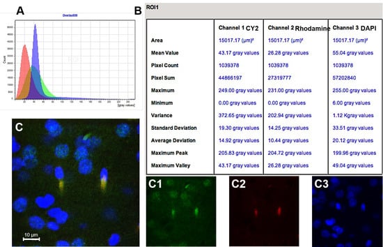 The methodology used to quantify the fluorescence emitted by the different fluorophores used to label NGB, NPs, and cell nuclei in histological sections of the infarcted cerebral parenchyma. A and B: Graphic representation (A) and semiquantitative data (B) of the mean grey values obtained by the confocal software AF (Leica) from fluorophores Cy2 (channel 1), rhodamine (channel 2), and DAPI (channel 3). (C): Merged image from a histological section of the infarcted parietal cortex, as the result of the overly of images (C1–C3), which, respectively, show Cy2, rhodamine, and DAPI fluorescence separately: Cell nuclei appear in blue (DAPI); neuroglobin (NGB) in green (Cy2) and nanoparticles (NPs) in red (rhodamine) are colocalized (light orange/yellow) in the cytoplasm of the nervous cells.