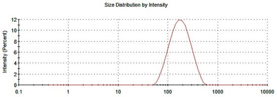 The size of the particles is a parameter highly related to the functionality of the NPs, which is directly connected to the appearance of the dispersion of NPs. In this sense, the macroscopic analysis shows the absence of aggregates or sediments. It presents turbidity and a white hue. According to the information previously provided by other authors [45], NPs with a size between 100 and 200 nm were easily captured by endocytosis, and particles greater than 300 nm were captured by phagocytosis [45]; therefore, the ideal size of the NPs linked to NGB should be below 300 nm. Table 1 shows the results obtained for the different measurements made on the dispersion of NGB–NPs: As seen, the average size was below 150 nm. According to the data analyzed, this size must be a consequence of NGB, which exerts a clear influence on this parameter with respect to the average size of the NPs without the drug, as we have previously published [25]. Even so, this size, alongside other parameters exhibited by the NGB–NPs (Table 1) was exceedingly acceptable for its functionality. On the other hand, polydispersion, a value inherent to the elaboration of the NPs, presented low values, which was indicative of the quality and homogeneity of the preparation. Figure 3 represents the size distribution of NGB–NPs by intensity. As can be seen, the data showed a unimodal size distribution, the fact that confirmed the previous. There was a predominance of medium-sized NPs and no other peaks of intensity were observed, confirming the absence of large aggregates.