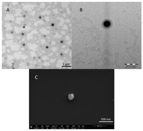 Microscopy characterization of NGB–NPs. (A) Field with different NGB–NPs at a scale of 1 µm (TEM). (B) Amplified field with a unique NP–NGB (500 nm) (TEM). (C) Microphotograph showing a unique NGB–NP with a 500 nm scale (SEM).